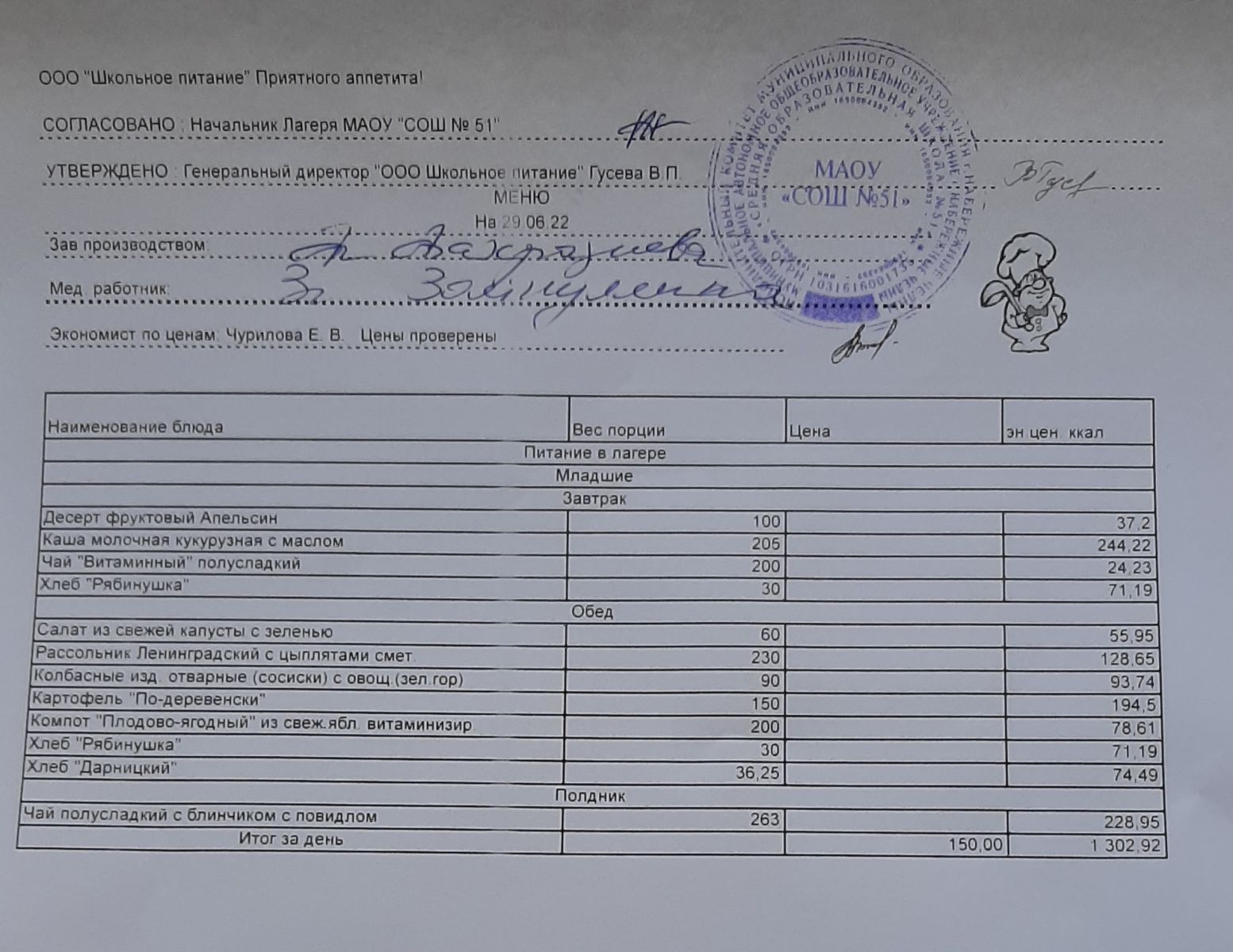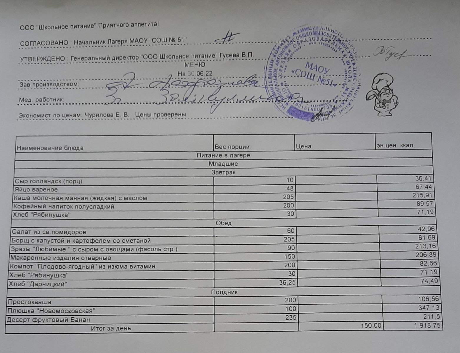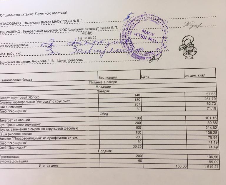 Меню пришкольного лагеря