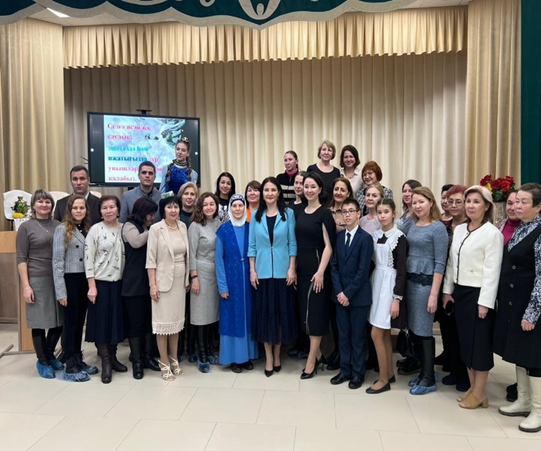 22 ноябрь көнне безнең мәктәбебездә бик күңелле кичә үткәрелде. Безгә кунакка Татарстан Фәннәр академиясенең Галимҗан Ибраһимов исемендәге Тел, әдәбият һәм сәнгать институты галимәсе, шагыйрә, популяр җырлар авторы Эльвира Ирфат кызы Сафина килде. Эльвира Ирфат кызы үзенең хезмәтләре хакында сөйләде, лексикография бүлегендә төзелгән сүзлекләр белән таныштырды. Үз хезмәте кергән сүзлекләр (“Татар теленең аңлатмалы сүзлеге”, “Татарча-русча-латинча кош атамалары сүзлеге”, “Татар теленең кыенлыклар сүзлеге”), “Кошлар” дидактик карточкалары, “Күңелдәге хатлар” китабы турында мәгълүмат биргәч, галимә аларның кайберләрен мәктәп китапханәсенә бүләк итеп калдырды. Эльвира Ирфат кызы Сафина безне матур, мәгънәле шигырьләрен укып та сөендерде. Очрашу кичәсенә Татарстанның атказанган артисты Илнур Гомәров, җырчы һәм композитор Гөлназ Закирова, Казан дәүләт мәдәният институты укытучысы, җырчы Зөхрә Вәлиуллина да килгәннәр иде. Алар безгә Эльвира Ирфат кызы сүзләренә иҗат ителгән җырларны башкардылар. Шулай ук безгә кунакка шагыйрә, тел галиме, филология фәннәре кандидаты Рәзинә Хәйбрахман кызы Мөхиярова да килгән иде. Мәктәбебез укучылары килгән кунакларны бик җылы каршы алдылар, бию-җырга, шигырь сөйләргә булган осталыкларын күрсәттеләр. Очрашу кичәсе бик күңелле үтте.