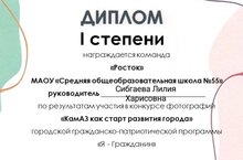 Команда учащихся нашей школы “Росток” в рамках городской программы “Я-гражданин” по результатам участия в конкурсе фотографий награждена Диломом первой степени. Подравляем команду школы и руководителя Сибгаеву Л.Х.