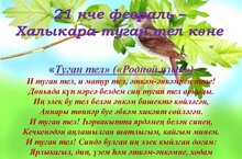 21 нче февраль- Туган тел көне. Мәктәптә Туган тел көненә багышланган чара узды. Сәхнәдән төрле телләрдә шигырьләр һәм җырлар яңгырады.