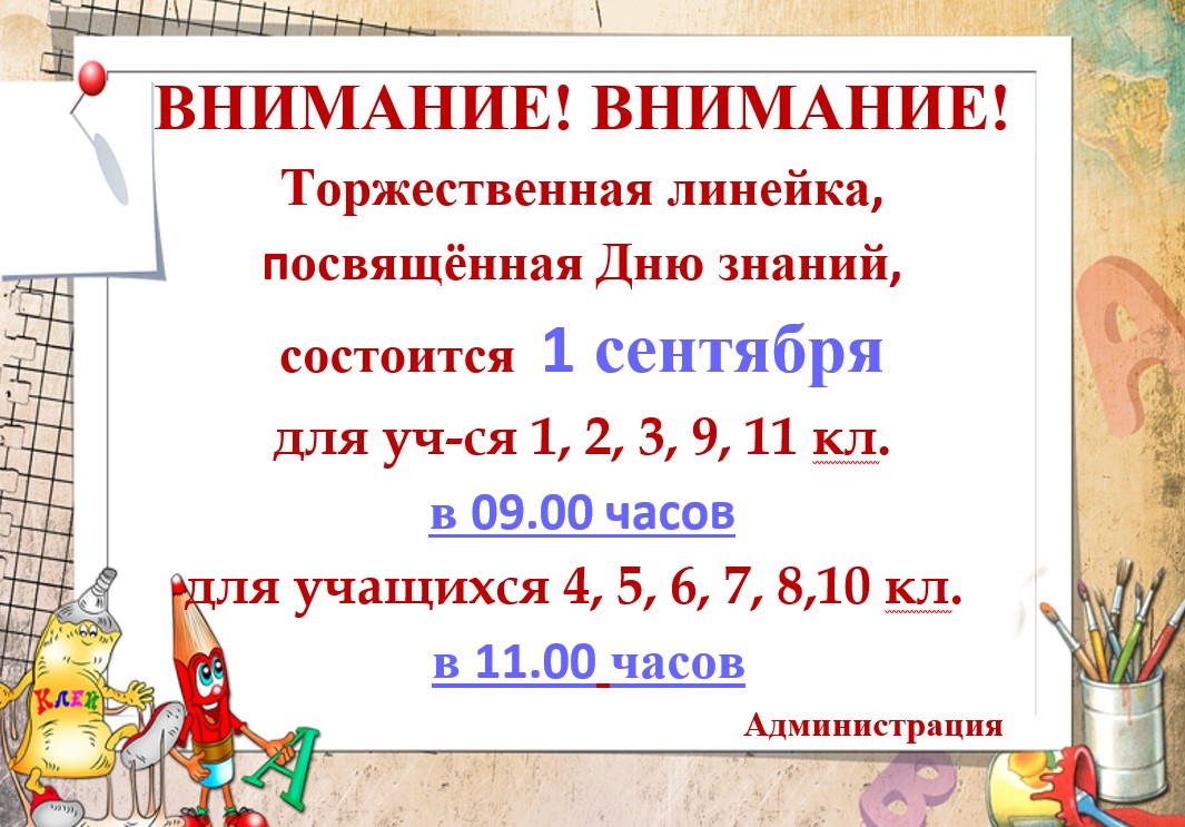 При себе иметь: тетрадь в клетку, ручку, цветные карандаши, пластилин, вторую обувь.Администрация школы