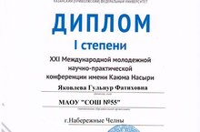 Учитель татарского языка Яковлева Г. Ф. участвовала в Международной молодежной научно- практической конференции имени Каюма Насыри. Результат - Диплом 1 степени.