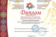 Республикакүләм Балалар фестиваленең “Иҗади гаилә” номинациясендә Бикташева Вилена һәм аның гаиләсе 2 дәрәҗәдәге диплом яулап алды.
