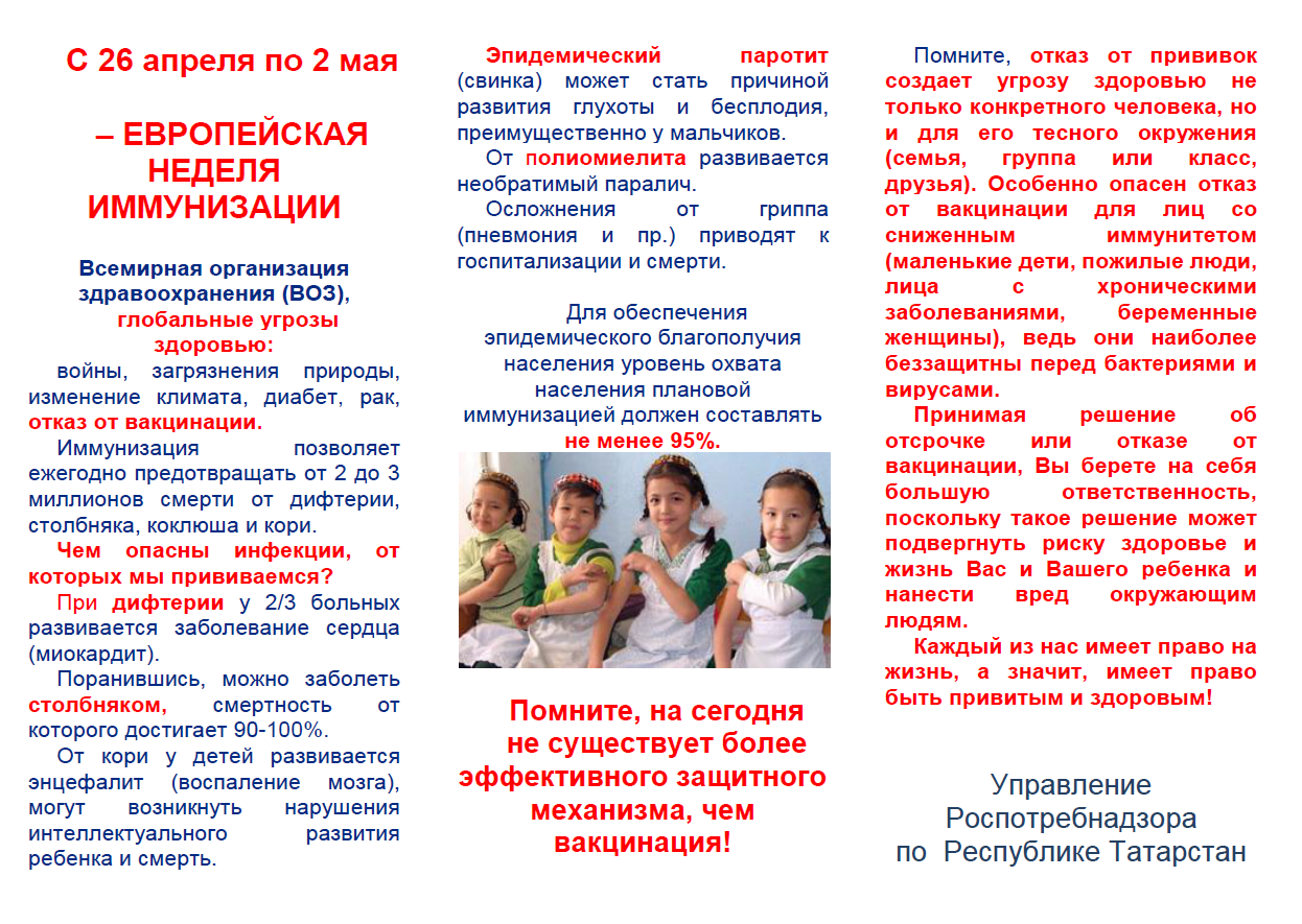 По инициативе Всемирной организации здравоохранения в Европе, в том числе в Российской Федерации и Республике Татарстан в период с 26 апреля по 2 мая 2021г. проводится Европейская неделя иммунизации (далее ЕНИ-2021).