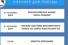 Уважаемые учащиеся, несмотря на ограичительные меры, празднование 75-леетней годовщины Дня Победы все же состоится. В течение дня всероссийская акция "Окна Победы", онлайн шествие бессмертного полка, в 19:00 о всей стране пройдет минута молчпния, в 19:01 - исполнение песни "День Победы". Завершится день акцией "Свеча памяти". Каждый желающий может зажечь свечу или фонарик.