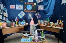 Сегодня в нашей школе,в холле второго этажа,расположилась открытая выставка рисунков в честь 12 Апреля «День космонавтики».Идя по школе,сразу же бросается в глаза данная выставка.На выставке представлены рисунки,поделки из папье-маше учеников нашей школы