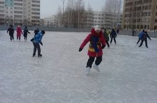 Учащиеся школы с удовольствием проводят время после школьных занятий на катке. Они дышат свежим воздухом, общаются, играют в хоккей и катаются на коньках.