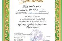 08.11.2016г в ЦДТ №16 «Огниво» в рамках городской программы «Имею право» состоялась игра «Интернет – друг или враг?». В рамках игры, учащиеся рассмотрели положительные и отрицательные стороны интернета, узнали информацию об истории развития интернета, правила пользования безопасным интернетом и ответили на каверзные вопросы. По результатам игры команда 8Б класса (рук. Газина Л.Н.) заняла 1 место. Так держать!