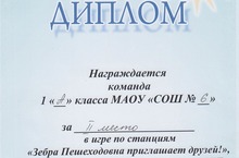 Сборная команда 1 А и 1 Г классов заняла призовое II место в игре по станциям "Зебра Пешеходовна приглашает друзей" в рамках городской программы по ПДД "Безопасное детство", проведенной центром детского творчества № 16 "Огниво". Поздравляем и желаем дальнейших успехов.