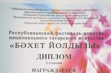 23 нче ноябрь көнне безнең шәһәребездә "Бәхет йолдызы" татар милли сәнгатенең республика фестиваль-конкурсында 9 сыйныфы укучысы "Туган як" җырын башкарып, I дәрәҗәдәге дипломга лаек булды. Чын күңелдән һәм укытучысын котлыйбыз! Аларга иҗадый уңышлар телибез! -