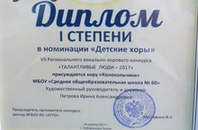 Поздравляем школьный хор "Колокольчики" и его руководителя Петрову Ирину Александровну с победой в VII Региональном вокально-хоровом конкурсе "Талантливые люди-2017" в номинации "Детские хоры"