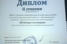 Исполнительный комитет города Набережные Челны и Управление образования и по делам молодежи отметили организацию работы нашей школы с обучающимися в рамках городской экологической операции "Птичья столовая" дипломом II степени.