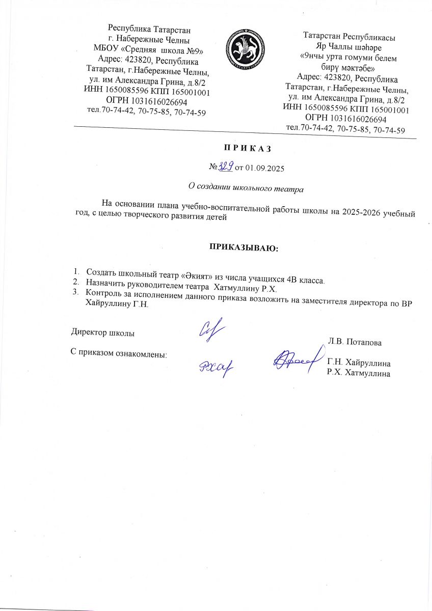 - Приказ о создании школьного театра