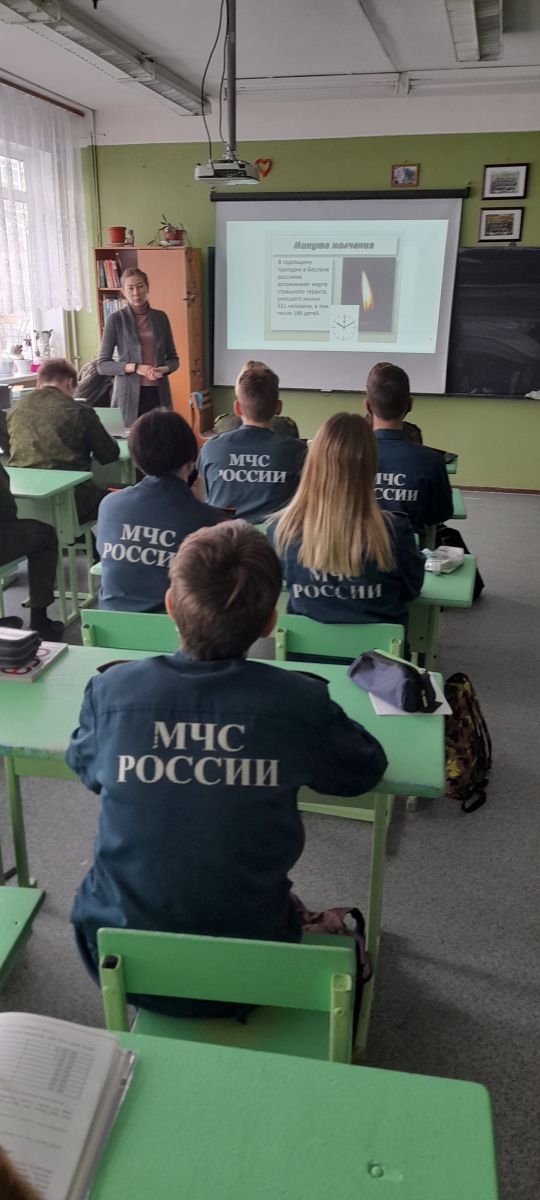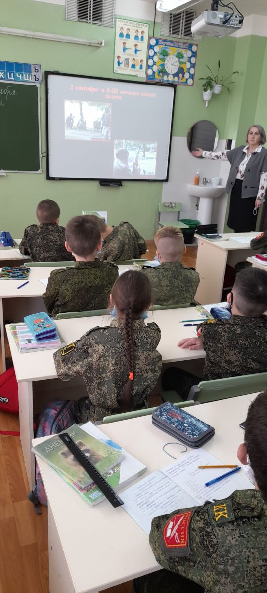 В рамках проведения мероприятий по солидарности с жертвами терроризма и отдавая дань памяти трагедии в Беслане в школе прошли классные часы с кадетами, на которых были проведены беседы с показом фильма про трагедию Беслана