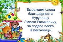 От всей души говорим большое спасибо нашему родителю, Нуруллову Эмилю Расиковичу, за привезённый песок для песочниц. Всех Вам благ и крепкого здоровья!