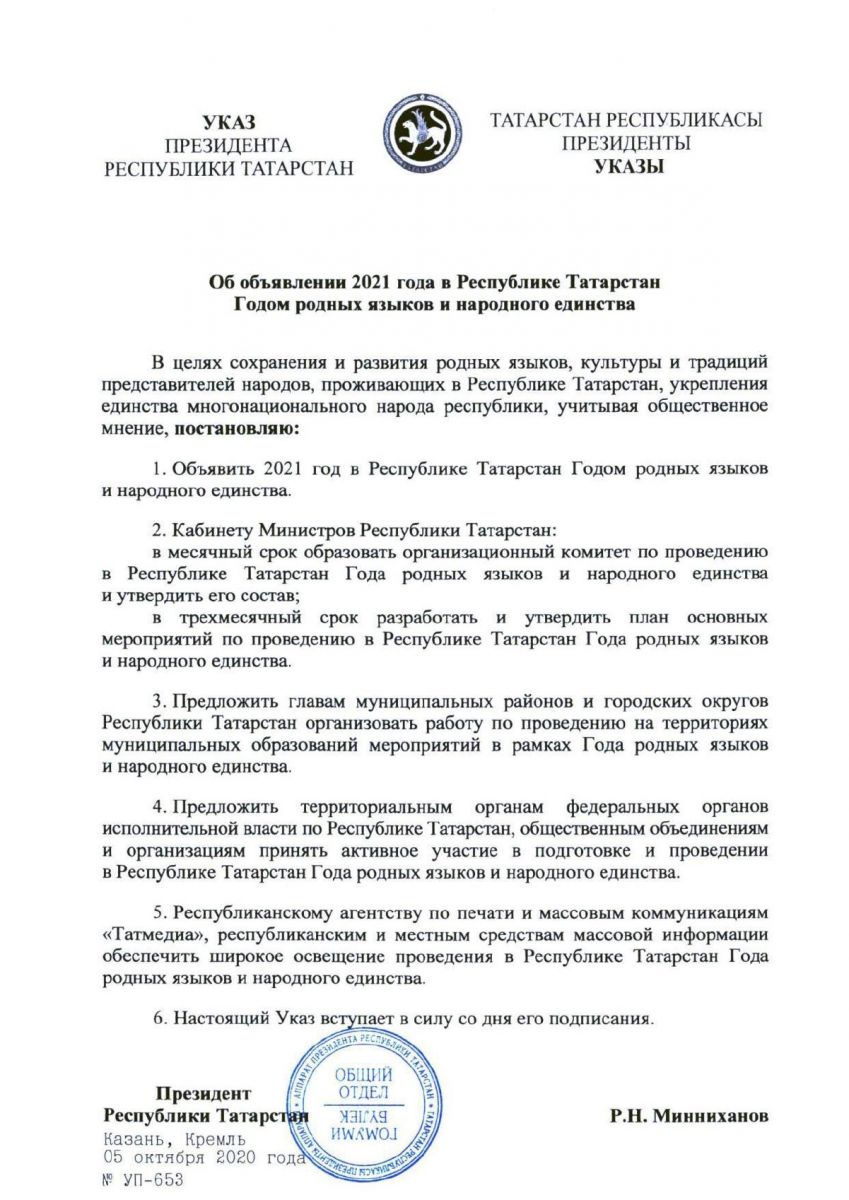 В целях сохранения и развития родных языков, культуры и традиций представителей народов, проживающих в Республики Татарстан, укрепления единства многоционального народа республики, учитывая общественное мнение, 2021 год в Республики Татарстан объявлен Годом родных языков и народного единства.