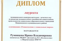 Подведены итоги муниципального конкурса настольно-печатных игр по развитию познавательных способностей дошкольников среди педагогов ДОУ. Наш воспитатель - Румянцева Ирина Владимировна награждена дипломом лауреата в номинации "Ознакомление с социальным миром". Поздравляем и желаем ей творческих успехов.
