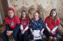 Юнармейцы школы вместе с председателем совета ветеранов Тартминой Л.М. посетили ее на дому и вручили продуктовый набор от депутата Афанасовского СП Булатова И.И. и благодарственное письмо от Совета ветеранов.