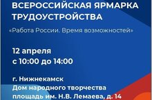Региональный этап Всероссийской ярмарки трудоустройства «Время возможностей» состоится 12 апреля текущего года.Место проведения ярмарки:«Дом народного творчества» г.Нижнекамск, площадь Н.В. Лемаева д.14