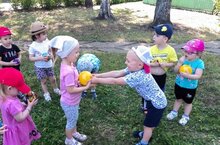 Дети с удовольствием играют в волейбол, футбол, в "Вышибалы" , "Попади в цель"и много других интересных игр с использованием мяча.