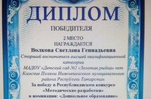 Республиканский конкурс «Методические разработки» в номинации «Дошкольное образование»: Волкова С.Г., Гребнева И.Г., Сергеева Т.А.– Диплом победителя, 2 место; Енизеркина Л.Н. – Сертификат 27.09.2019