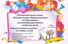 Акция "Игрушечный Бум" по сбору игрушек для развивающей комнаты особенных детей (в Молодежном центре "АЛАН"). Воспитатели Вострухина В.П., Саматова И.Р. и воспитанники старшей группы №13 подарили игрушки для детей 13.10.2017