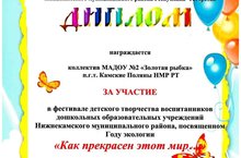 Фестиваль детского творчества воспитанников ДОУ, посвященный Году экологии "Как прекрасен этот мир..." (на базе Культурного центра "Чулман-Су" пгт Камские Поляны). Коллектив награжден Дипломом МБУ "УДО" за участие. Поздравляем!!! 21.04.2017