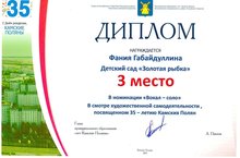 Смотр художественной самодеятельности среди предприятий и организаций, посвященный 35-летию Камских Полян (на базе КЦ «Чулман Су» пгт Камские Поляны). Диплом Главы МО «пгт Камские Поляны» за 3 место в номинации «Вокал-соло» Габайдуллиной Фании Илдусовне. Поздравляем!!! 10.04.2017