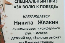 Открытый районный конкурс вокалистов «Музыкальная галактика», посвященный 50-летию г.Нижнекамска. Дипломом МБУ «Управление культуры» Исполнительного комитета НМР РТ в номинации «Специальный приз «За волю к победе» награжден воспитанник подготовительной к школе группы №9 Жвакин Никита в номинации "Конферанс" и музыкальный руководитель Т.А.Исаева. Поздравляем!!! Желаем дальнейших творческих побед!!! 29.02.2016
