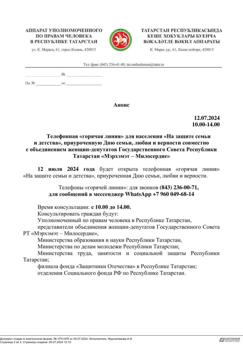 Телефонная "горячая линия" для населения "На защите семьи и детства", приуроченную Дню семьи, любви и верности совместно с объединением женщин-депутатов Государственного Совета Республики Татарстан "Мәрхәмәт - Милосердие"12.07.2024 с 10.00-14.00(843)236-00-71WhatsApp +7-960-049-68-14 -