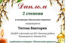 Районный конкурс «Пасхальная радость»: - Османов Эмир и Акатьева Е.В., Носова М.Н. – Диплом 3 степени в номинации «Декоративно-прикладное творчество»; - Гаранина Николь и Трифонова Н.В. – Диплом 2 степени в номинации «Декоративно-прикладное творчество»; - Иванов Андрей и Носова М.Н. – Диплом 1 степени в номинации «Декоративно-прикладное творчество»; - Фасхутдинова Екатерина и Носова М.Н. – Диплом 3 степени в номинации «Декоративно-прикладное творчество»; - Темникова Валерия и Ваняшина В.А. – Диплом 1 степени в номинации «Декоративно-прикладное творчество»; - Темников Никита и Хабибрахманова З.Х. – Диплом 1 степени в номинации «Декоративно-прикладное творчество»; - Хадыева Аделина и Закирова Л.Р. – Диплом 2 степени в номинации «Декоративно-прикладное творчество»; - Зайнудинов Юсуф и Алешина А.В. – Диплом 3 степени в номинации «Декоративно-прикладное творчество»; - Терехина Наталья Ивановна – Диплом 2 степени в номинации «Пасхальный кулич»; - Мальцев Дмитрий и Хабибрахманова З.Х. – Диплом 2 степени в номинации «Пасхальная открытка»; - Семенова Агата и Торопова Е.Н. – Диплом 2 степени в номинации «Пасхальная открытка»; - Бакланова Алена и Акатьева Е.В. – Диплом 3 степени в номинации «Пасхальная открытка»; - Куликова Карина и Трифонова Н.В. – Диплом 3 степени в номинации «Пасхальная открытка»; - Васин Владислав и Акатьева Е.В. – Диплом 2 степени в номинации «Пасхальная открытка»; - Баяндин Радмир и Носова М.Н. – Диплом 2 степени в номинации «Пасхальная открытка»; - Титова Виктория и Носова М.Н. – Диплом 2 степени в номинации «Пасхальная открытка»; - Храмов Даниил и Енизеркина Л.Н. – Диплом 1 степени в номинации «Пасхальная открытка»; - Сафина Милана и Енизеркина Л.Н. – Диплом 2 степени в номинации «Пасхальная открытка»; - Банникова Карина и Енизеркина Л.Н. – Диплом 2 степени в номинации «Пасхальная открытка»; - Гилимов Ринас и Закирова Л.Р., Алешина А.В. – Диплом 2 степени в номинации «Пасхальная открытка»; - Заболонская Полина и Закирова Л.Р. – Диплом 3 степени в номинации «Пасхальная открытка»; - Чадулина Кира и Закирова Л.Р. – Диплом 3 степени в номинации «Пасхальная открытка»; - Банникова Карина и Алешина А.В. – Диплом 2 степени в номинации «Пасхальная открытка» 19.04.2023