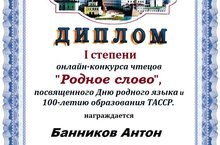 Городской онлайн-конкурс чтецов "Родное слово", посвященный Дню родного языка и 100-летию образования ТАССР. Поздравляем победителей конкурса: Банников Антон, старшая группа №10, Диплом 1 степени; Асхатова Алсу, старшая группа №10, Диплом 2 степени; Жукова Екатерина, старшая группа №8, Диплом 2 степени. 25.04.2020
