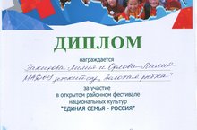 Открытый районный фестиваль национальных культур "ЕДИНАЯ СЕМЬЯ - РОССИЯ" на базе культурного центра "Чулман-су" пгт Камские Поляны НМР РТ. Наши участницы - Закирова Лилия Раисовна и Орлова Лилия Ильгизовна - награждены Дипломом за участие. ПОЗДРАВЛЯЕМ!!! 01.11.2019