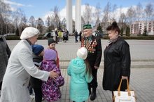 Утро 4 мая. Сквер Н.В. Лемаева. Дети с радостью поздравляли горожан с предстоящим праздником, прикрепляли бутоньерки на одежду. Желали им мирного неба над головой, добра и здоровья. Все в ответ благодарили детей, обнимали, говорили добрые слова. Эта акция не оставила равнодушным ни одного ребёнка. Мы помним, мы гордимся подвигом наших солдат!