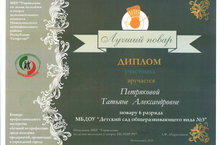 Повар детского сада Петрякова Татьяна Александровна принила участие в конкурсе профессиональнального мастерства "Лучший повар" среди молодёжи предприятий, организаций и учреждений города. Конкурс организован МБУ "Управление по делам молодёжи и спорту " исполнительного комитета НИжнекамского муниципального района Республики Татарстан.