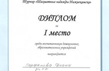 Наша воспитанница подготовительной к школе группы №9 Парфенова Диана заняла I место в турнире "Шахматные надежды Нижнекамска" среди воспитанников дошкольных образовательных учреждений, который прошел на базе школы №15 24.04.2015г. Молодец Диана!!! Мы гордимся тобой!