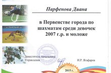 Наша воспитанница подготовительной к школе группы № 9 Парфёнова Диана участвовала в "Первенстве города по шахматам среди девочек 2007 г.р. и молодежи", была награждена дипломом I степени. Мы гордимся нашей воспитанницей и желаем ей дальнейших успехов!