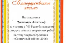 19 воспитанников детского сада: Гек Андрей,Гареева Дарина,Мухаметшина Диана, Михеева Мирра,Кузьмин Артем, Сапрыкин Мирон, Маслова Катя,Фасхиева Альбина,Гилазов Ранис,Миргалимов Даниэль,Оленева Ксюша,Закиров Наиль,Скалова Настя, Евдокимова Алина,Чукманцев Саша,Никитина Милена и Гайфуллин Эмиль получили Благодаарственные письма за участие в IIY Республиканском конкурсе детских творческих работ на тему энергосбережения "Солнечный зайчик-2016". Дети нарисовали рисунки, придумали стихи и рассказы, которые бережно были записаны воспитателями и родителями.