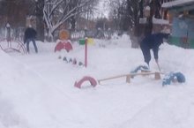 Родители принимают активное участие в жизни детского сада. Чистка снега на площадке для прогулок детей.