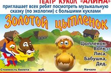 Театр кукол "Алина" приглашает всех ребят на музыкальную сказку по экологии с большими куклами "Золотой цыпленок".
