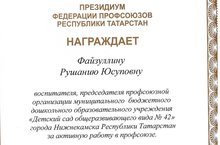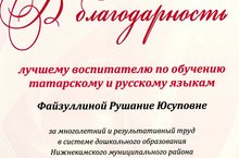 Во дворце творчества и молодежи имени И.Х.Сайдашева прошло торжественное мероприятие, посвященное Дню дошкольного работника, в котором были награждены самые лучшие работники детских садов города Нижнекамска и Нижнекамского муниципального района. За многолетний и результативный труд в системе дошкольного образования НМР "Благодарностью МБУ УДО" была награждена Файзуллина Рушания Юсуповна, воспитатель по обучению татарскому и русскому языкам детского сада №42. Рушания Юсуповна мы Вас поздравляем и желаем больших творческих успехов.