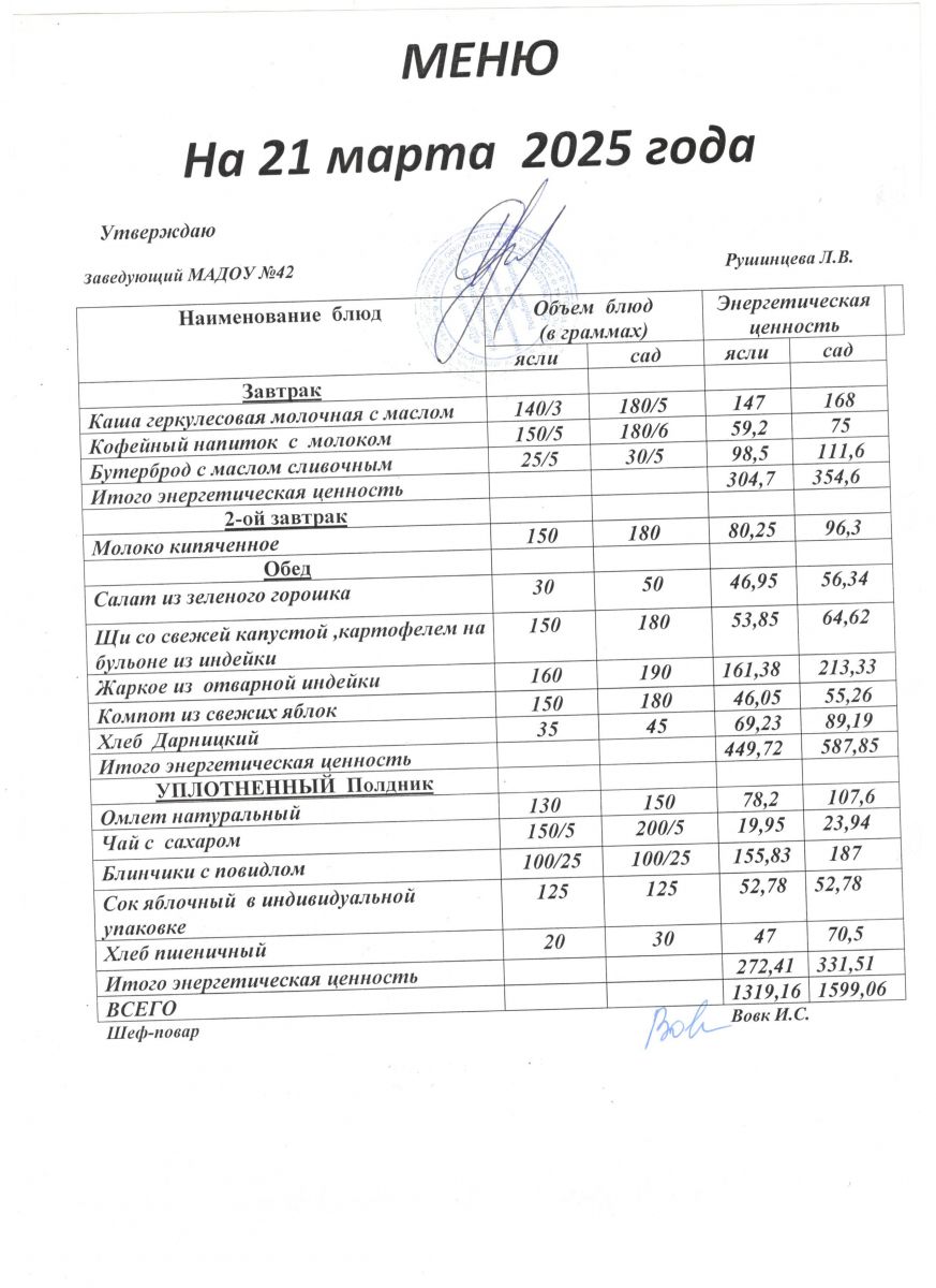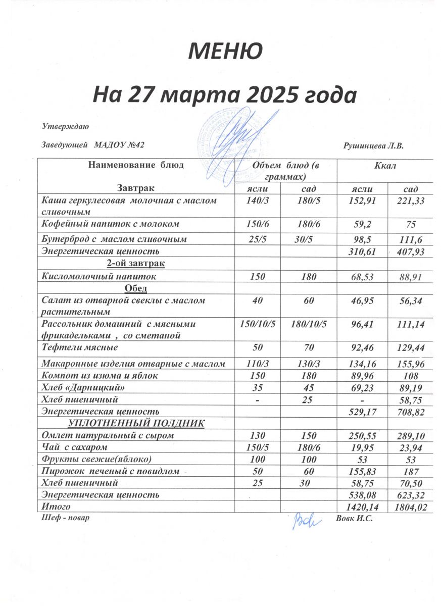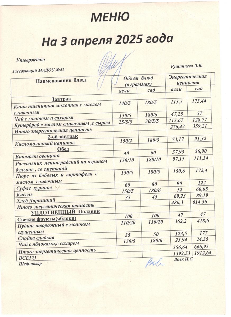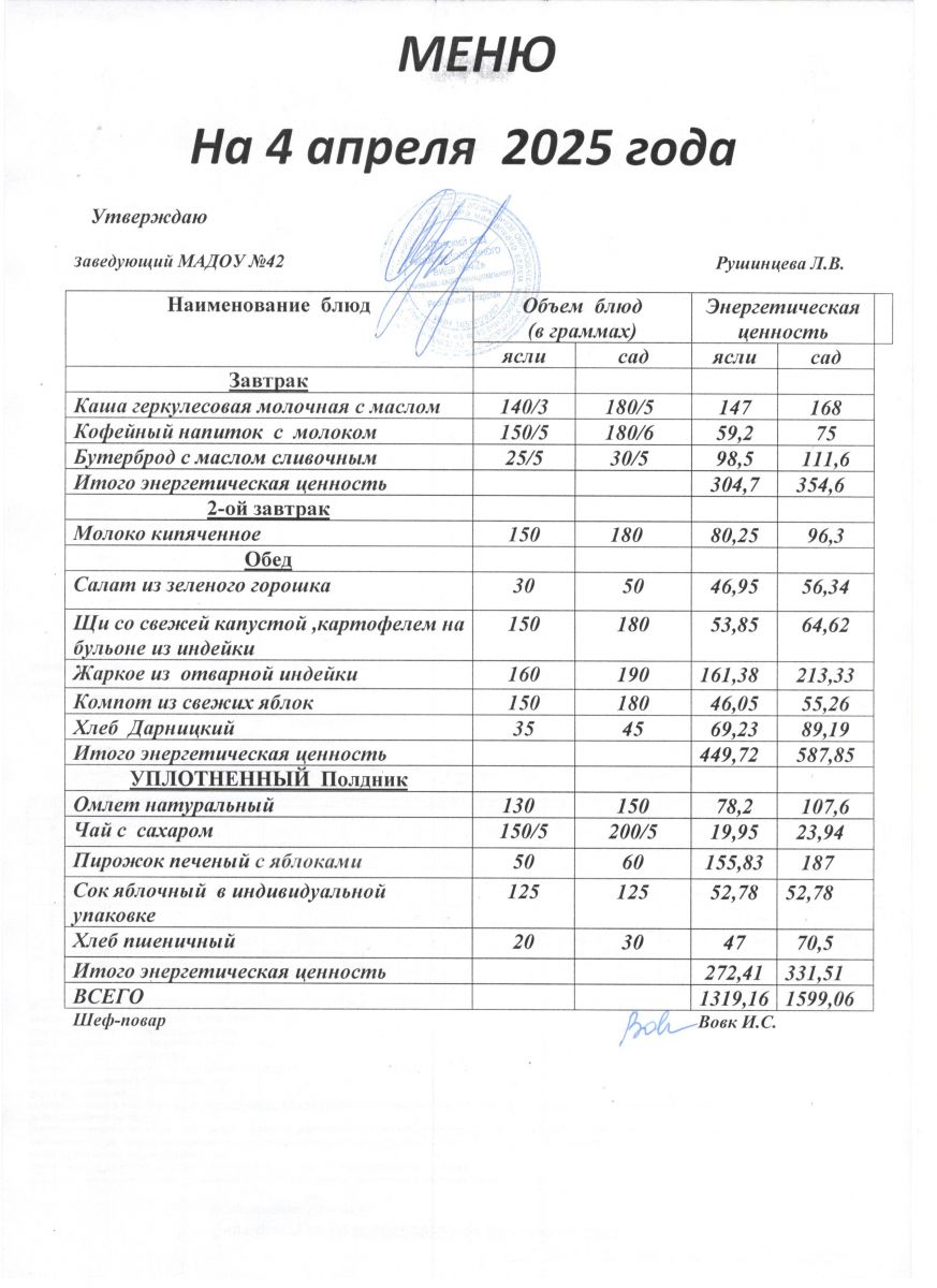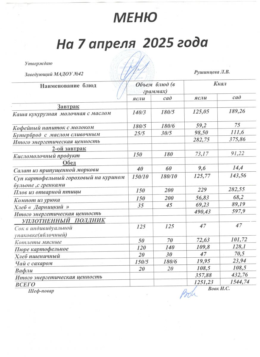 При разработке меню учитывают возрастные группы: 1-3 лет и 3-7 лет. Набор блюд при этом единый, различен объем порций для младших и старших детей. Энергетическая ценность меню просчитано по установленным нормам: для ребенка младше трех лет составляет 1400 ккал, а старше трех лет – 1800 ккал.