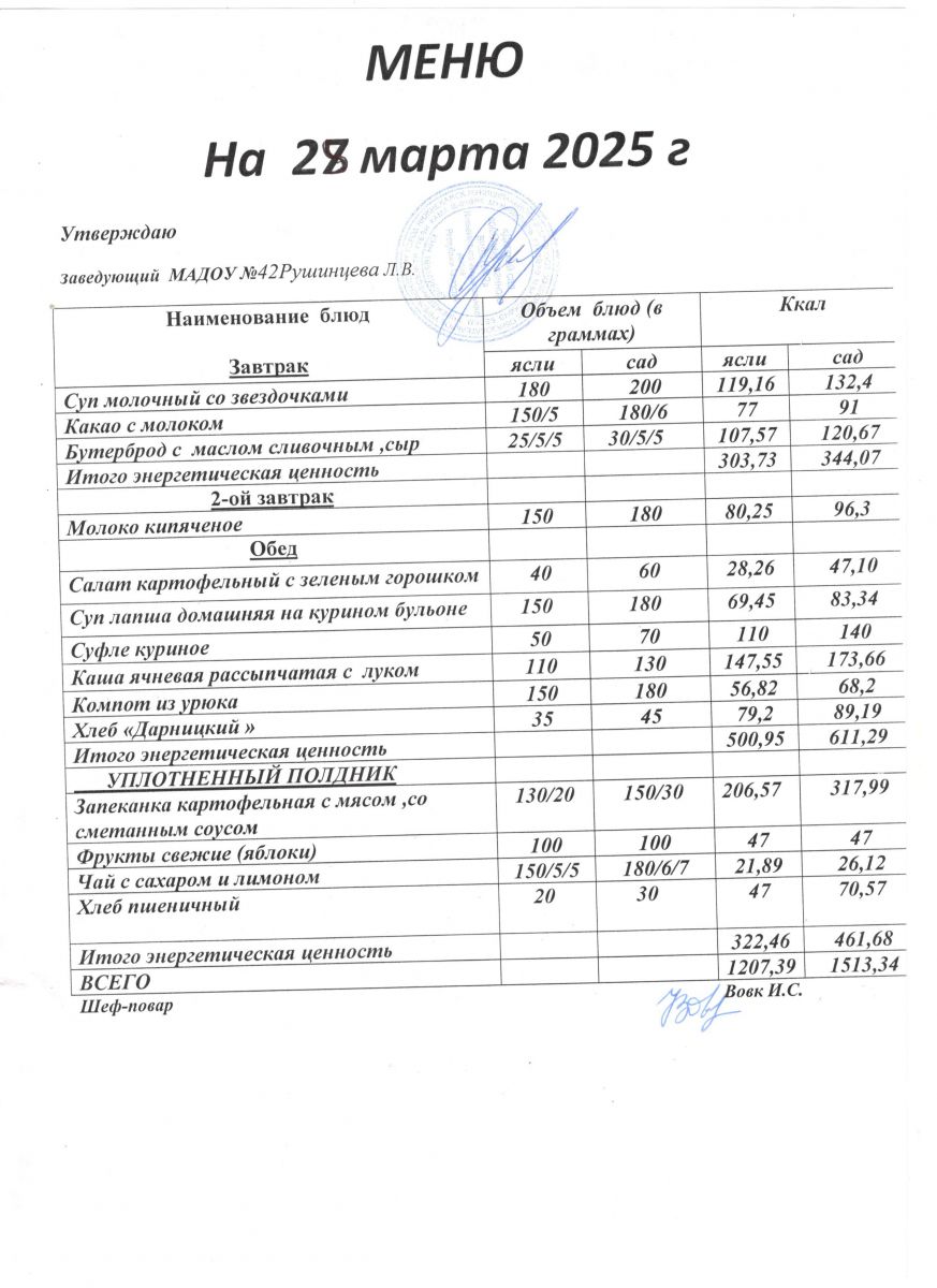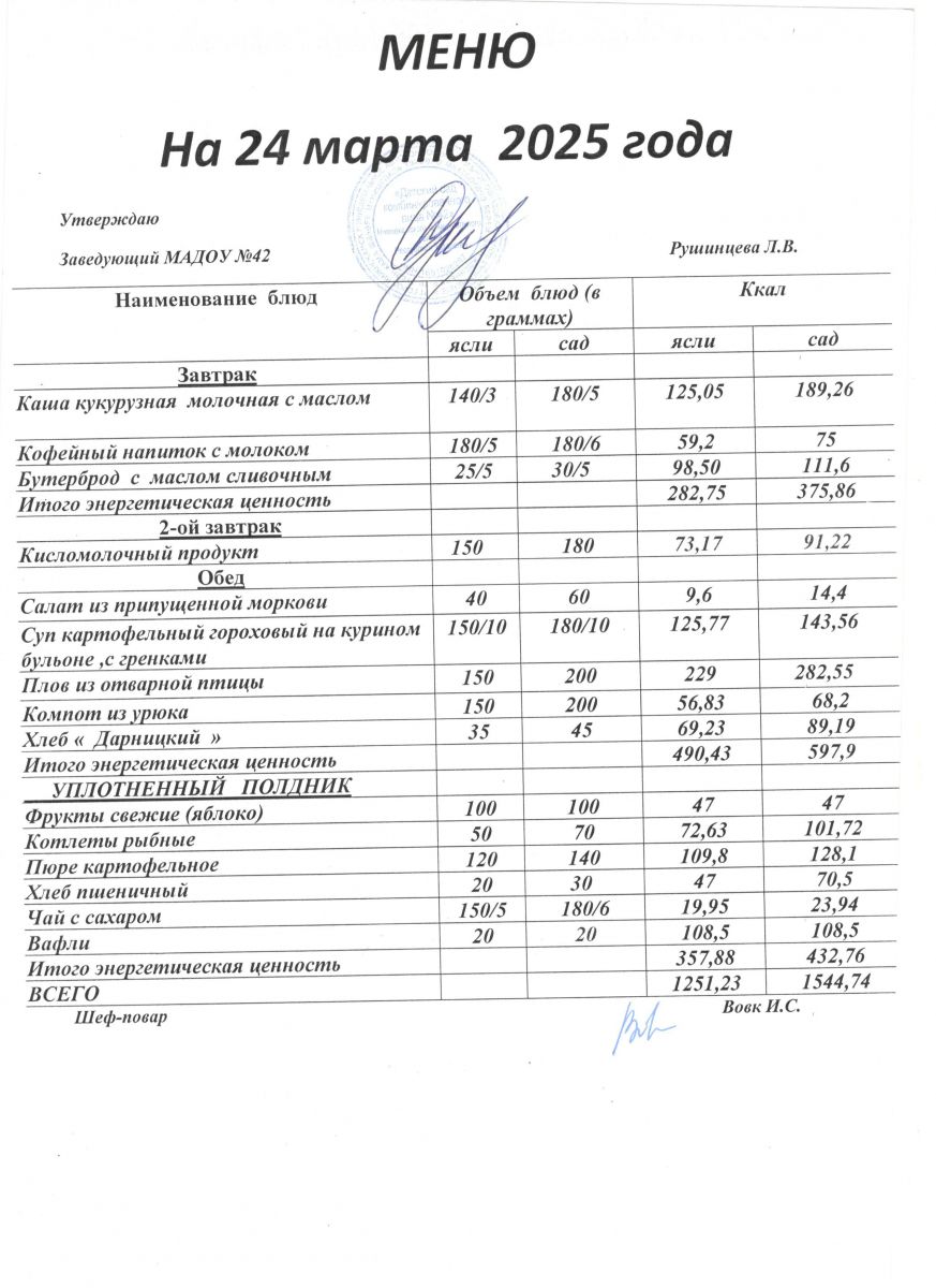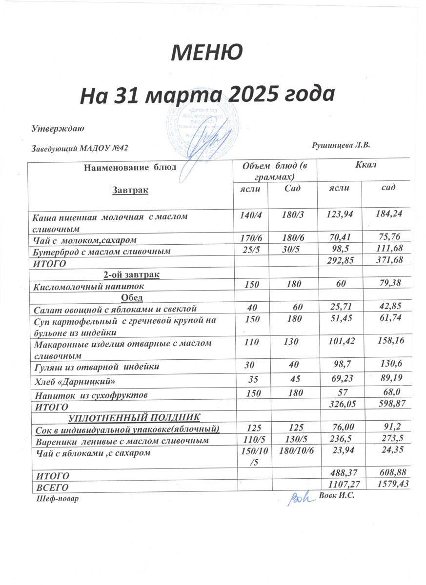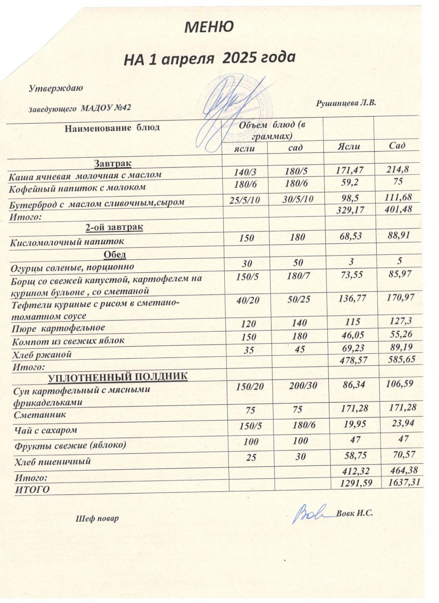 Детский сад работает по утвержденному 10-ти дневному меню с учетом рекомендуемых среднесуточных норм питания. Рацион питания разнообразен как за счет расширения ассортимента продуктов, так и за счет разнообразия блюд, готовящихся из одного продукта.