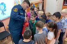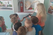 Командир отделения.Валентин Витальевич рассказал детям о работе пожарных, с какими трудностями сталкивается пожарный, какая у них спецодежда, о новых технологиях и как пожарные узнают о пожаре и тушат его. Показал огнетушитель, рассказал как им пользоваться в случае пожара. Познакомил детей с правилами безопасности и как вести себя, если начался пожар. И в конце провёл викторину. -