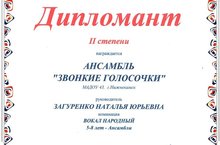 Наш ансамбль "Звонкие голосочки" под руководством музыкального руководителя Загуренко Н.Ю. стал дипломантом II степени в конкурсе-фестивале в рамках международного проекта "PROдвижение".