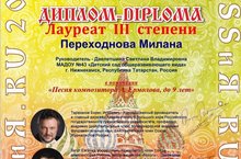 Наша воспитанница, Переходнова Милана (музыкальный руководитель Давлетшина с.В.) стала лауреатом III степени в Международном конкурсе искусства и творчества ROSSиЯ.