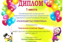 В Республиканском конкурсе детских мультипликационных фильмов, приуроченный к Году родных языков Республики Татарстан "Разноцветье Поволжья" творческий коллектив "Мирас" под руководством Гирфановой Алсу Зуфаровны заняли три призовых места в номинации "Лучший мультфильм на татарском языке"