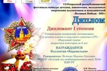 Наш детский танцевальный коллектив «Карамельки» под руководством музыкального руководителя Волковой Марины Олеговны, стали Дипломантами I степени VII открытого Республиканского фестиваля-конкурса детских, юношеских, молодежных творческих коллективов и исполнителей «Великая Победа-2021», в специальной номинации, посвящённой «Году родных языков и народного единства в РТ».