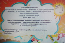 Уважаемые родители нашего микрорайона! С 1 марта 2018 года на базе детского сада №61 (адрес: улица Бызова, 17А) начинает работу адаптационная группа кратковременного пребывания для детей с 1,5 - 2 лет. Цель: создание плавного перехода от воспитания в условиях дома к воспитанию детей в дошкольном учреждении, социализация детей раннего возраста, позволяющая обеспечить успешную адаптацию ребенка в условиях ДОУ. -
