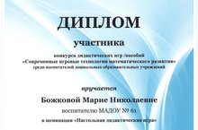 Воспитатель Божкова Мария Николаевна приняла участие в конкурсе дидактических игр/пособий "Современные игровые технологии математического развития"среди воспитателей дошкольных образовательных учреждений, представив пособие "Занимательная математика"
